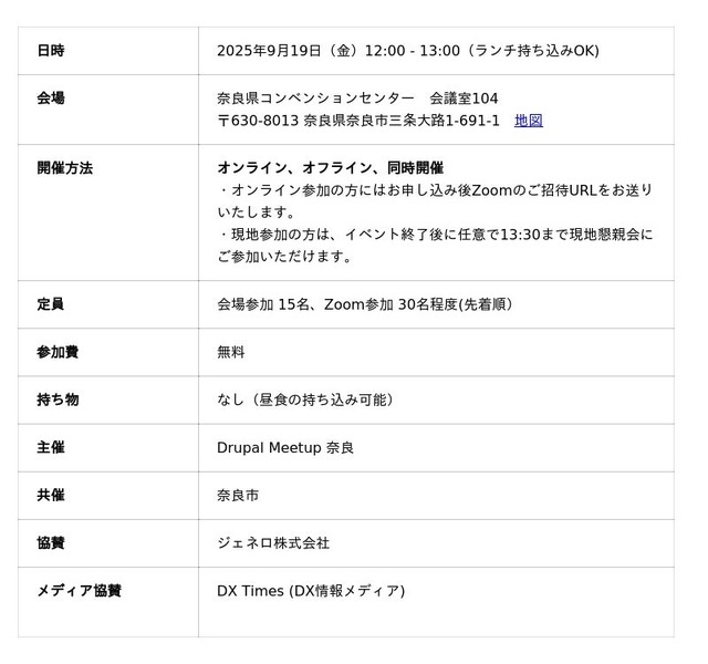 本イベントではDXやDrupalの基礎知識や最新情報を共有するだけでなく、DX分野に興味はあるものの敷居の高さを感じている初心者や非エンジニアにとって、DXの第一歩を踏み出すきっかけとなることを目指しています。