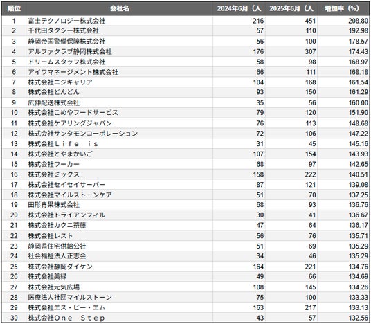 株式会社SalesNow(本社:東京都渋谷区、代表取締役:村岡功規、以下「当社」)は、国内540万社の企業情報を完全網羅した日本最大級のデータベース「SalesNow DB」より、人口の多い上位30都市を対象とした「従業員数増加率ランキング」を発表しました。本リリースでは、各都市別のデータをもとに、今回は「静岡市に本社を置く企業」を対象に、従業員数の増加傾向にフォーカスします。