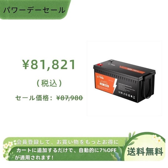 ※LiTimeはバッテリーだけでなく、LiFePO4対応の充電器、インバーター、MPPTソーラーチャージコントローラーなどの関連アクセサリーも対象となります
