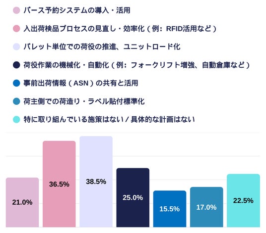 - 荷待ち・荷役時間削減の施策として、最も実施率が高かったのは「パレット単位での荷役の推進」(38.5%)。次いで「入出荷検品プロセスの見直し」(36.5%)となり、物理的な荷役作業やプロセスの効率化が中心。- トラックの到着時間を平準化するのに有効な「バース予約システムの導入・活用」は 21.0% に留まり、デジタルを活用した抜本的な対策はまだ浸透していない。