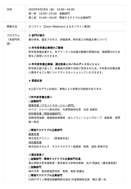 本アワードは「金融部門」と「環境サステナブル企業部門」の2部門構成となっています。今回の公募説明会では、第一部で「金融部門」、第二部で「環境サステナブル企業部門」に関する説明を行います。