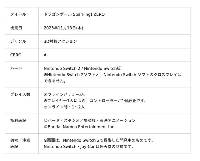 今後の情報は、Nintendo Switch 2/Nintendo Switch版「ドラゴンボール Sparking! ZERO」特設サイト、及び「ドラゴンボール」家庭用ゲーム公式Xをご確認ください。