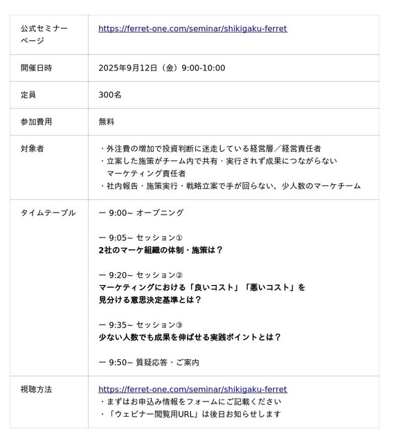 本ウェビナーでは、「人手不足でも“外注卒業”を実現したいBtoB企業の経営層・マーケ責任者」の皆様へ向けて、月間3,000件超のリードを創出する識学のマーケ戦略フレームと、2,000社以上のBtoBマーケ支援実績を持つノーコードCMS×MA「ferret One」が少人数マーケでも高速PDCAを回すための運用ノウハウを一挙公開します。