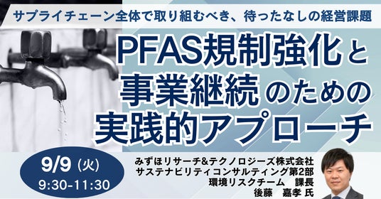 JPI(日本計画研究所)は、みずほリサーチ&テクノロジーズ株式会社 サステナビリティコンサルティング第2部 環境リスクチーム 課長 後藤 嘉孝 氏を招聘し、PFAS規制強化と事業継続のための実践的アプローチについて詳説いただくセミナーを開催します。