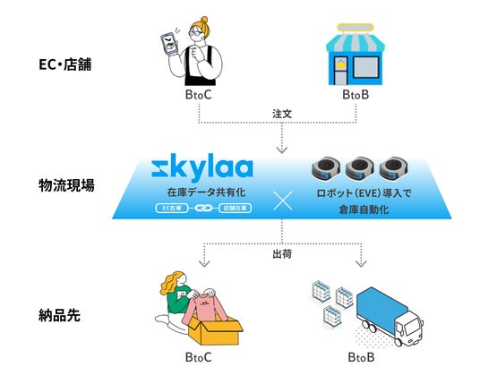 本プロジェクトでは、ERP※1・OMS※2・WMS※3といった既存システムを変更せずにBtoB・BtoC在庫の一元管理を可能にする、ギークプラスのオープンSCMソリューション「skylaa」が導入されました。さらに、自動棚搬送ロボット「EVE」42台を稼働させ、倉庫の省人化と高効率化を同時に実現しました。