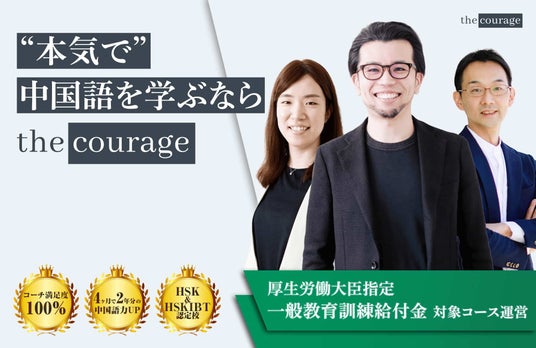 the courage(カレッジ)は中国政府公認の資格試験HSK認定の中国語コーチングスクールです。「効果的な学習方法」「時間確保」「学習の継続」という、語学学習において必要不可欠な3要素全てについて、プロのコーチが1人ひとりに寄り添って徹底的にサポートすることで、圧倒的な中国語力の伸びを実現し続けています。(URL:https://courage-lang.com/)