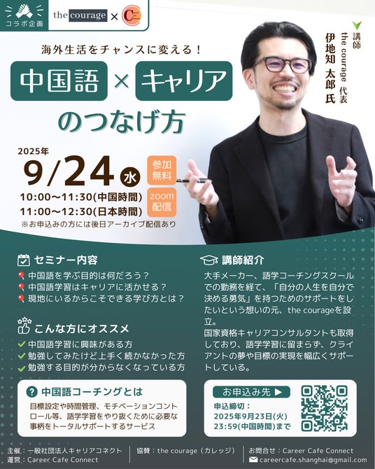 中国語コーチングスクール「the courage(カレッジ)」は、駐在員パートナーのキャリアや学びを支援する一般社団法人キャリアコネクトと関連団体の「Career Cafe Connect」と共同運営で、2025年9月24日に無料オンラインセミナー「海外生活をチャンスに変える!中国語×キャリアのつなげ方」を開催します。本セミナーは、駐在員パートナーが海外生活を前向きに捉え、自分らしいキャリアや学びのスタイルを見つけるきっかけづくりとして企画されたものです。