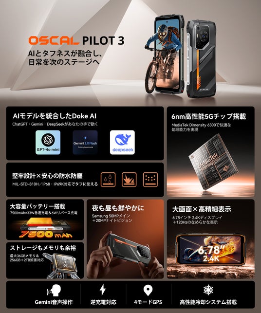 AI、5G、タフネス――すべてを備えた次世代タフネススマホ『OSCAL Pilot3』が、Amazonで購入可能。28%OFFの特別セールを2025年8月25日(月)~8月31日(日)に実施中!本製品は、自社開発のDokeOS 4.0を搭載し、DeepSeek-R1、ChatGPT、Gemini AI 2.0 Flashの3つAIモデルを統合。アウトドアでも都市部でも快適に使える高性能タフネススマホとして、ユーザーに新しい体験をもたらします。