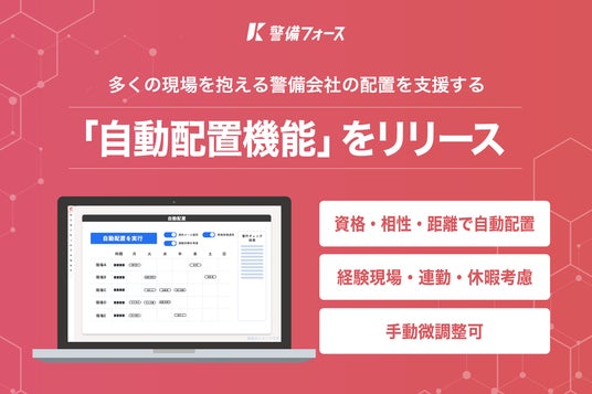 警備会社向けのオールインワンSaaS「警備フォース」を提供する株式会社メディカルフォース(本社:東京都品川区、代表取締役CEO:畠中 翔一、以下「メディカルフォース」)は、「警備フォース」の新たな機能として、多拠点・多数現場を運営する警備会社の業務負荷を軽減する「自動配置機能」をリリースしたことをお知らせします。