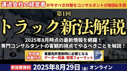 日本最大級の物流コンサルティングファーム 船井総研ロジ株式会社(本社:東京都中央区、代表:橋本直行、以下「船井総研ロジ」)は、2025年8月29日(金)15:00~16:00、 運送会社・物流会社の経営者を対象にした「トラック新法解説セミナー」をオンラインで開催しました。
