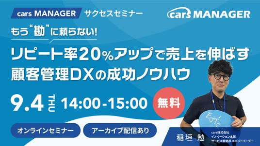 こうした背景を受け、cars株式会社は 自動車整備業界向け顧客管理DXツール「cars MANAGER」 を活用し、実際にリピート率20%アップを実現したノウハウを公開する「cars サクセスセミナー」を開催いたします。