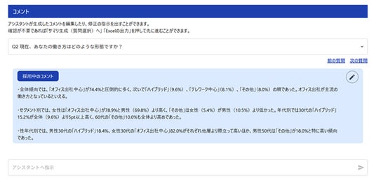 ・AIアシスタントが設問ごとの分析コメントと調査結果全体のサマリを自動生成