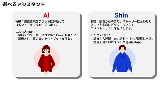 また、分析を行うAIアシスタントには、調査結果をフラットに評価して分析する「Ai」(アイ)と、ストーリーに合わせたスコアを中心に分析する「Shin」(シン)、2人の人格が設定されています。2人のいずれかを選択することで、目的に応じた分析コメントとサマリを導き出すことが可能です。