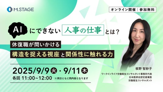 株式会社エムステージ(本社:東京都品川区、代表取締役:杉田雄二)産業保健事業部は、9/9(火)・11(木) 同日ともに11時より、休職・復職の対応から組織全体を捉え直す「構造的視点」を解説するウェビナーを開催いたします。