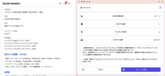 Chrome 拡張機能が各種求人媒体から候補者レジュメを瞬時に読み取り、AI が自動でマッチング・文面生成まで完結。