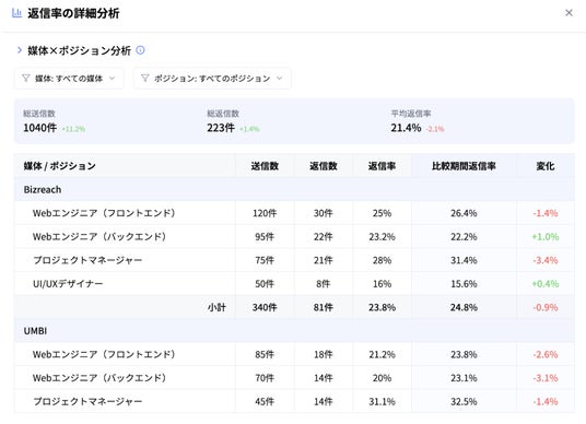さらには、媒体別・テンプレート別・時間帯別の返信率をリアルタイムで分析し、次のアクションに活かせる改善提案を提示します。