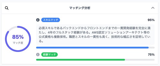 スキル・経験・条件の3軸から候補者のマッチング度をスコア化。