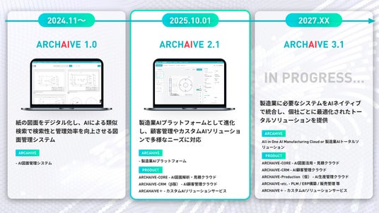 当社は、「ARCHAIVE 2.1」の提供を皮切りに、今後は生産管理やPLM(製品ライフサイクル管理)、ERP(統合基幹業務システム)など、製造業に必要なあらゆるシステムをAIネイティブで統合する「ARCHAIVE 3.1」の開発を進めてまいります(2027.XX予定)。