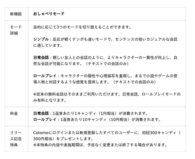 本モードでは、「シンプル」「日常会話」「ロールプレイ」の3種類が選べます。特に「ロールプレイ」モードでは、キャラクター性を持ったAIとの従来の会話に加え、ト書きが表示されることで、物語や小説の世界に入り込むような臨場感を味わえます。なお、今回の新機能リリースを記念して、「Cotomo」にログイン、新規登録したすべてのユーザーに、本モードで利用できるアイテム(キャンディ)をプレゼントします。