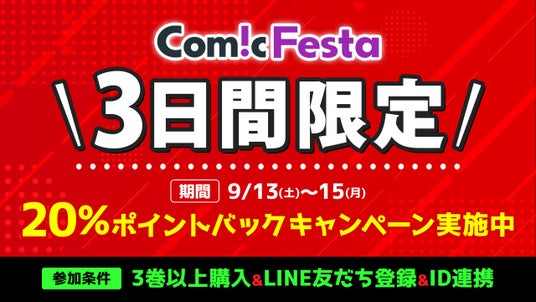 株式会社ウェイブ(本社:東京都豊島区、代表:関口航太)が運営する電子コミック配信サービス「ComicFesta(コミックフェスタ)」にて、9月13日(土)~9月15日(月)の3日間限定で、LINE公式アカウントの友だち登録およびID連携を行い、キャンペーン期間中に対象条件を満たした方へ、ご購入ポイントの20%分を還元するお得なキャンペーンを実施いたします。