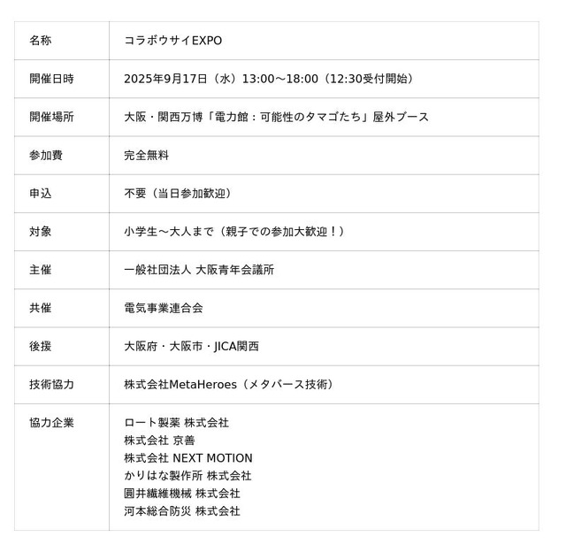 一般社団法人 大阪青年会議所(大阪市)は、2025年9月17日(水)、大阪・関西万博「電力館:可能性のタマゴたち」において、防災ビジネスコンテストと体験型ワークショップを融合させた『コラボウサイEXPO』を開催します。