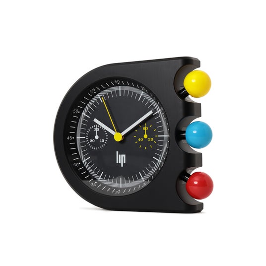 象徴的な黄・青・赤の球体は、腕時計におけるクロノグラフボタンから“時を彩るリズムパーツ”へと進化し、壁面に鮮やかなアクセントを添えます。