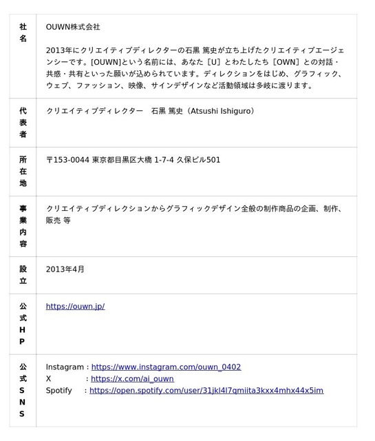 OUWN株式会社は、グラフィック、CI・サイン、コピー設計、アートディレクションなど幅広い領域で活動し、国内外で高い評価を得てきました。弊社代表である石黒篤史は、クリエイティブディレクター・アートディレクターとしての活動だけにとどまらず、リアルな現場での事業にも積極的に参画しています。・MISSH inc. 取締役(池尻大橋 居酒屋「OMA」設立・オーナー)