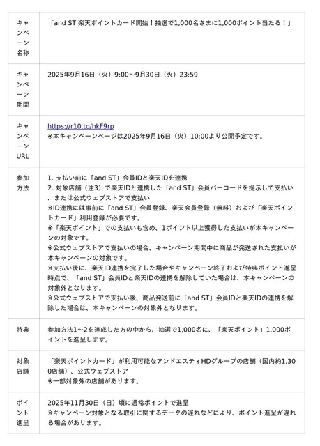 本導入を記念して、2025年9月16日(火)から9月30日(火)まで、「and ST 楽天ポイントカード開始!抽選で1,000名さまに1,000ポイント当たる!」キャンペーンを実施します。