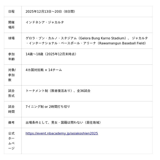 一般社団法人NB.ACADEMY(本社:東京都渋谷区、代表理事:柴田章吾、以下「当社」)は、2025年12月にインドネシア・ジャカルタで開催予定の「第2回アジア甲子園大会」において、山九株式会社(本社:東京都中央区、代表取締役社長CEO:中村公大、以下「山九」)が、新たにオフィシャルサプライヤーとして参画したことをお知らせいたします。