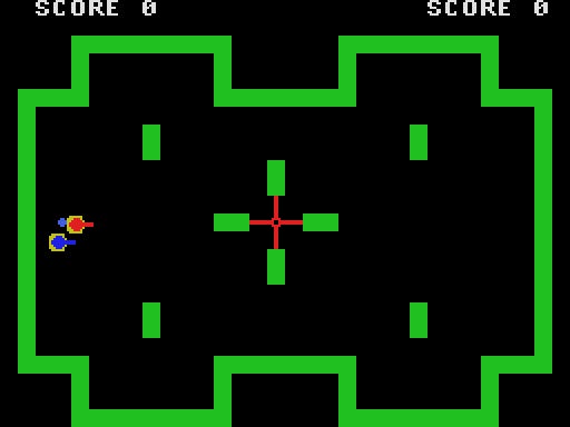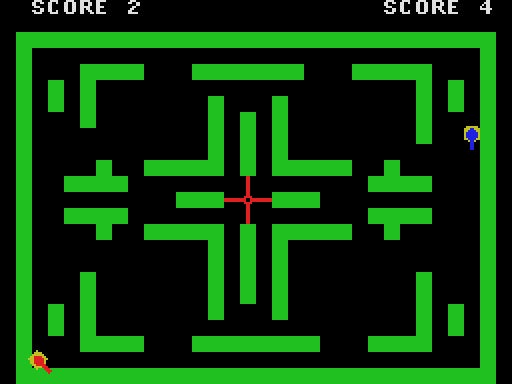 君はタンクを操縦しつつ誘導弾で敵を撃破しなければならない。誘導弾は君の操縦するタンクの向きに誘導されて飛んでいく。弾ばかり気にしていると・・・・・・。ほらほら、自分の撃った弾に当たっているのは誰だ? 2人で遊べば、気分はもう戦場。興奮しすぎて喧嘩しないように。(1、2人用)