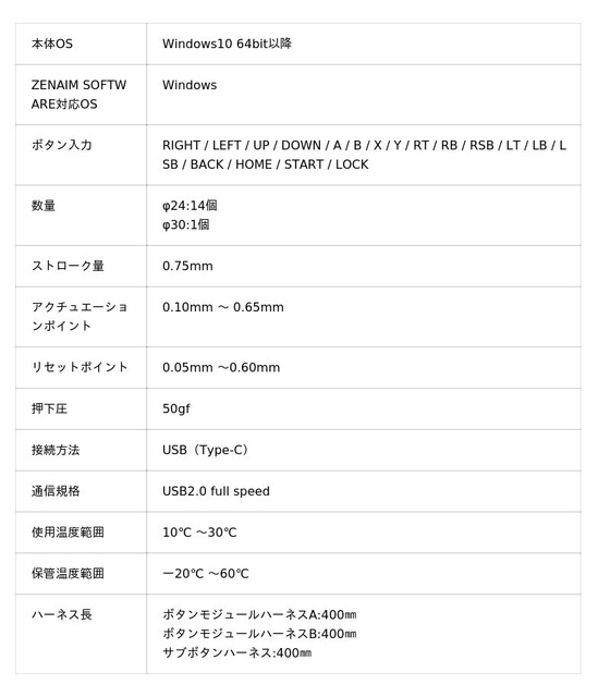 ZENAIM ARCADE CONTROLLER のストローク量はわずか0.75mm。