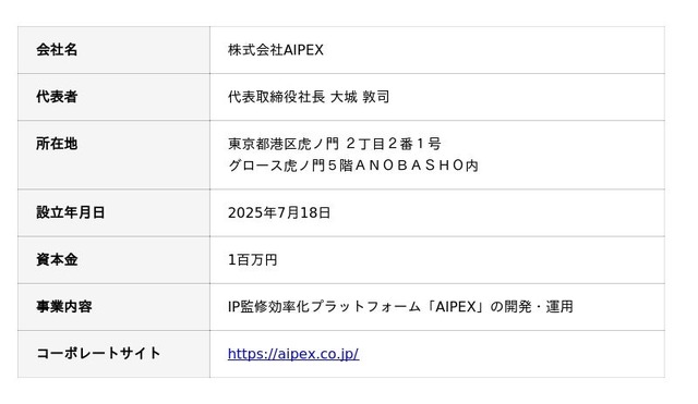 AIを活用したIP(知的財産)監修効率化プラットフォーム「AIPEX(TM)(アイペックス)」を開発・運営する株式会社AIPEX(本社:東京都港区、代表取締役社長:大城 敦司、以下、AIPEX)は、株式会社NTTドコモ(以下、ドコモ)からスピンアウト※1し、本日2025年9月16日より事業を開始したことをお知らせします。