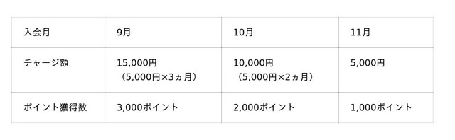 入会月から毎月5,000円チャージすることで、本キャンペーンにおける上限分のポイント獲得が可能です。