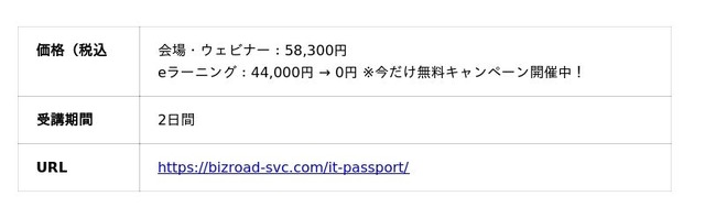 2日間で未経験でもITパスポートに合格するための知識を習得できるセミナーです。