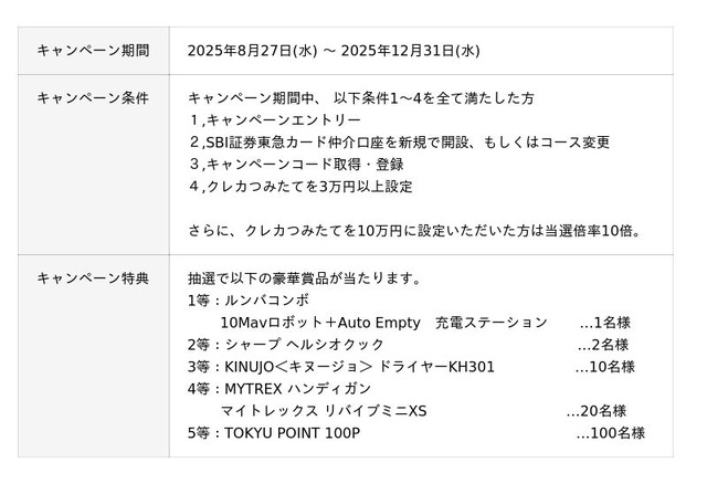 東急カード株式会社(以下、「東急カード」)は、株式会社SBI証券(以下、「SBI証券」)との金融商品仲介サービスにおいて、2025年7月末時点で東急カード仲介口座における預り資産が1,000億円を突破したことをお知らせします。これを記念し、期間限定で豪華賞品が当たる「預り資産1,000億円突破記念祭」(以下、「本キャンペーン」)を実施します。