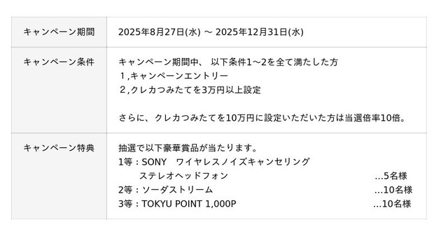 本キャンペーンでは、東急カードで、「クレカつみたて」の積立金額を3万円以上に設定された方を対象に、抽選で豪華賞品をプレゼントします。