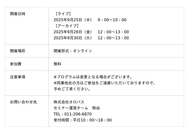 SEOツール「パスカル」の開発・提供を行う株式会社オロパスは、2025年9月25日(木)に「AI時代のマーケティング戦略とSEO対策から読み解く顧客ジャーニーの重要性」をテーマに共催ウェビナーを開催いたします。また、9/26(金)、9/30(火)の日程でアーカイブ配信も行います。