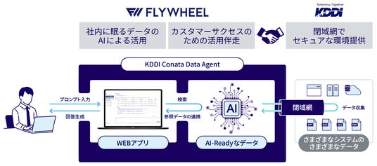 本サービスは、フライウィールの情報検索技術と生成AIを活用したデータ活用アシスタント「Conata Data Agent」に、KDDIの閉域網サービス「KDDI Wide Area Virtual Switch 2」を組み合わせることが可能です。