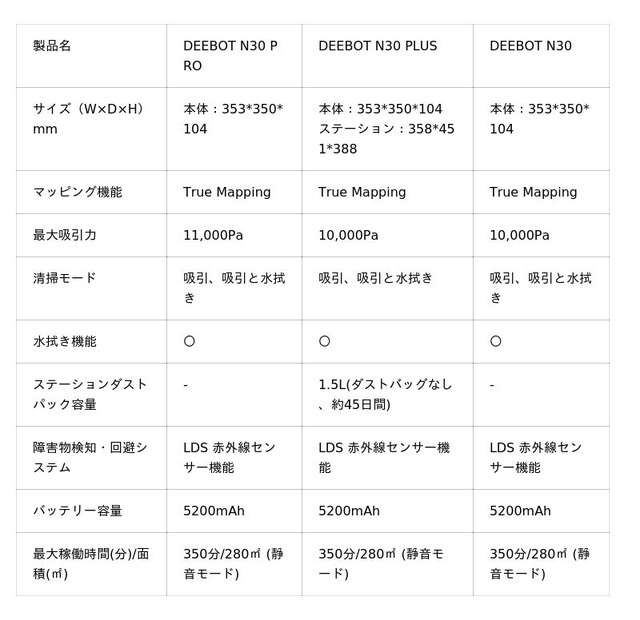 N30 PLUS:https://www.ecovacs.com/jp/deebot-robotic-vacuum-cleaner/deebot-n30-plus-black