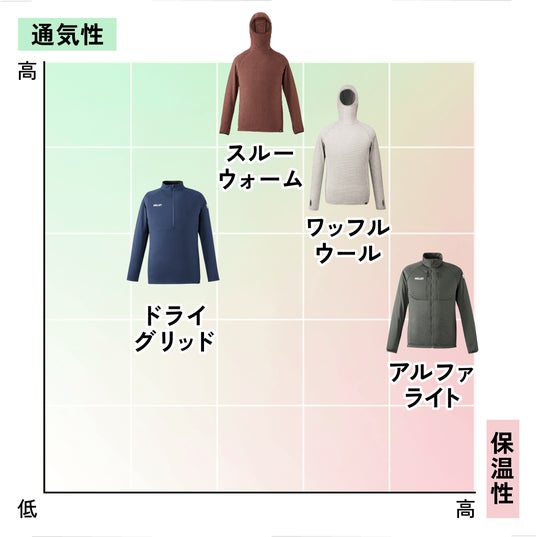 2025年は、スルーウォームハイブリッドジャケット、ドライグリッドハーフジップ、アルファライトベストなど新作を追加。それぞれの特徴を活かしたデザインの追求、レイヤリングの自由度を高めるベストタイプの追加など、選択肢が一層充実しました。