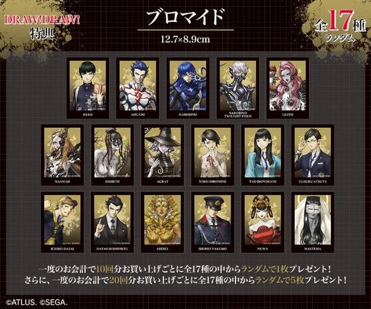 一度のお会計で10回分ご購入ごとに特典ブロマイド(全17種)の中からランダムで1枚、20回分ご購入ごとにランダムで5枚プレゼント!
