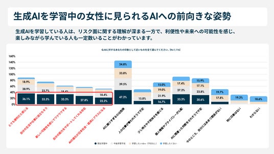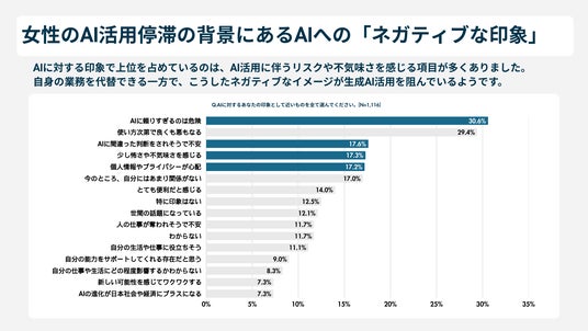 - AI利用が進まない要因:多くの女性が生成AIにネガティブな印象を抱いていることが明らかに。「AIに頼りすぎるのは危険」と回答した人は30.6%、「取り組みたいが自分には難しそう」と答えた人は41.0%にのぼった。