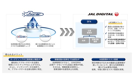 JALデジタルは、JALグループのシステム運用・保守対応だけでなく、JALグループの事業を通じて培った技術力・発想力を活かしたIT/DXコンサル事業やソリューションサービス事業をJALグループ以外の企業にも展開することで、研鑽を積んだデジタルのチカラで価値を創造し広く社会に貢献できる企業へと成長することを目指しています。その一方で、より効果的な新規顧客の開拓をはじめとする営業戦略の高度化が課題になっていました。また、営業力を強化・効率化していくうえで、社員が個人で紙管理していた名刺情報を営業データとして共有し、活用していくことや今後新規取引企業が増えていくことを踏まえ、与信管理業務の効率化なども課題となってきました。これらの課題を踏まえ、JALデジタルが着目したのが、全国1250万件を網羅した企業データベース「LBC」を基盤とするユーソナーサービスでした。