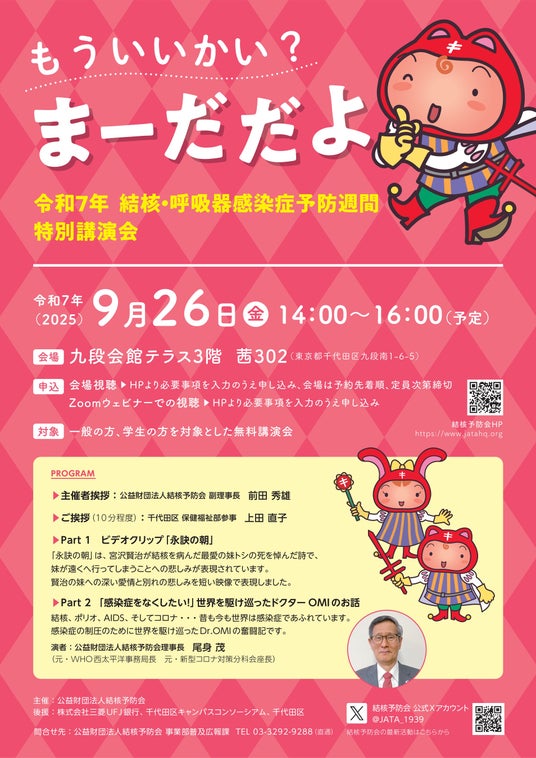 公益財団法人結核予防会(JATA、東京都千代田区、理事長:尾身茂、https://www.jatahq.org/)は、2025年9月26日(金)、「結核・呼吸器感染症予防週間」の特別講演会として、当会理事長・尾身茂による『「感染症なくしたい!」世界を駆け巡ったドクターOMIのお話』を開催いたします。