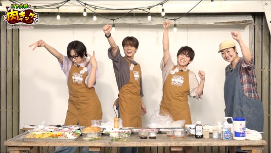 番組後半は本格的に山下の誕生日を祝う時間となり、まずはシャンパンを開けることに。蒼井がしばらく格闘するも中々開栓できず八代に交代します。しかし、八代も悪戦苦闘。「おめでとう!」という掛け声と共に何度も開栓を試みますが、その度に開かずもどかしい時間が流れ、ついに八代が開栓に成功し乾杯しました。そしていよいよ、今回のメインであるスペアリブとタンドリーチキンを焼いていき、豪快に肉を食べていました。
