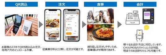 「CHUUMO」は、アプリのダウンロードやユーザー登録が不要で、QRコードをスマホで読み取り、来店客がセルフで飲食店での注文から会計までを済ませることが可能なサービスです。受注業務、会計業務をセルフ化することで、飲食店様における人手不足の解消に寄与します。来店客のスマートフォンでのキャッシュレス決済に対応の他、インバウンドにも対応しております。また、マミヤ・オーピーグループの経営基盤を活かした手厚いサポート体制が整っており、全国に保守拠点、365日対応可能な自社コールセンターを構えております。