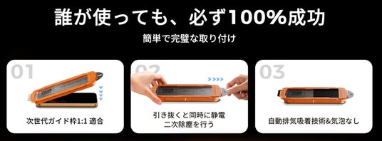iPhone 17 Proは画面サイズが大きく、フィルム貼り付けの難易度も高いとされています。ZENISSはその課題を解決するため、「自動位置合わせ+自動吸塵」構造を搭載した新設計ガイド枠を開発しました。フィルムを置くだけで正確に位置が決まり、ガイドを引くだけでホコリを吸着。気泡やずれによる貼り直しを防ぎ、初めての方でもスムーズに仕上げられます。