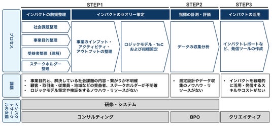 本サービスは、スタートアップやゼブラ企業がインパクトを策定・評価・活用するプロセスにおいて直面しがちな「ノウハウやリソース不足」を、コンサルティング・BPO・システム活用によって解決するとともに、情報発信を通じて効果の最大化を支援します。プロセスは3つのステップで構成され、策定から発信までを一気通貫でサポートします。
