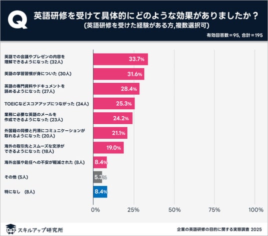 英語研修を受講した95名に効果を尋ねたところ、「英語での会議やプレゼンの内容を理解できるようになった」が33.7%で最も多く、次いで「英語の学習習慣が身についた」が31.6%といった結果となった。