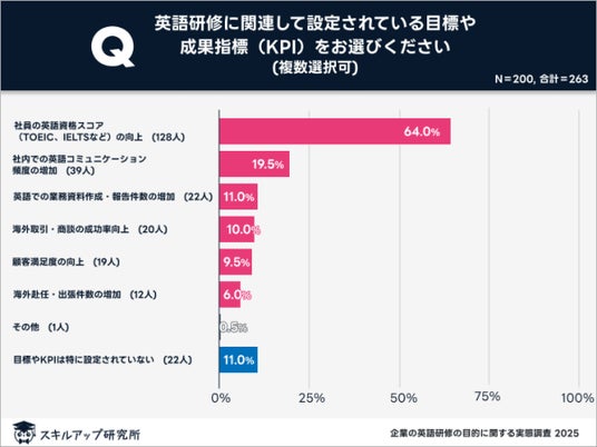 英語研修に関連して設定されている目標や成果指標(KPI)について尋ねたところ、「社員の英語資格スコア(TOEIC、IELTSなど)の向上」が64%と最も多く挙げられた。